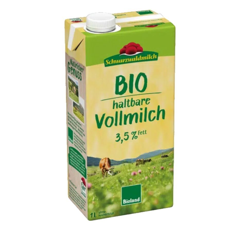 Schwarzwaldmilch Organic Whole Cow's Milk is a long-life whole milk with 3.5% fat. The Schwarzwaldmilch organic line includes the unique milk from certified organic farms. Bioland dairy farms stand for species-appropriate animal husbandry and a natural, genetically-free feeding base.